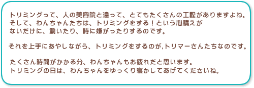 簡単に洗って乾かして切って・・・じゃないんです。 人の美容院と比べて、なが〜い時間が必要ですよね。 もっと簡単に終わるもんじゃないの? って思いますよね。 お預けしてお迎えまでの間、わんちゃんたちがどんなふうに、 トリミングしてもらっているのか、 気になりませんか?